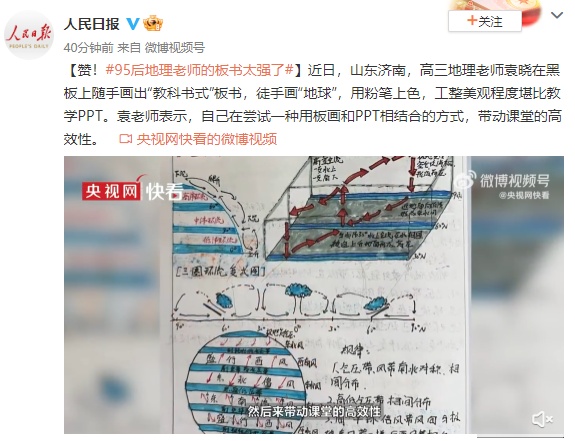 【赞!95后地理老师的板书太强了】近日,山东济南,高三地理老师袁晓在黑板上随手画出“教科书式”板书,徒手画“地球”,用粉笔上色,工整美观程度堪比教学PPT。袁老师表示,自己在尝试一种用板画和PPT相结合的方式,带动课堂的高效性。