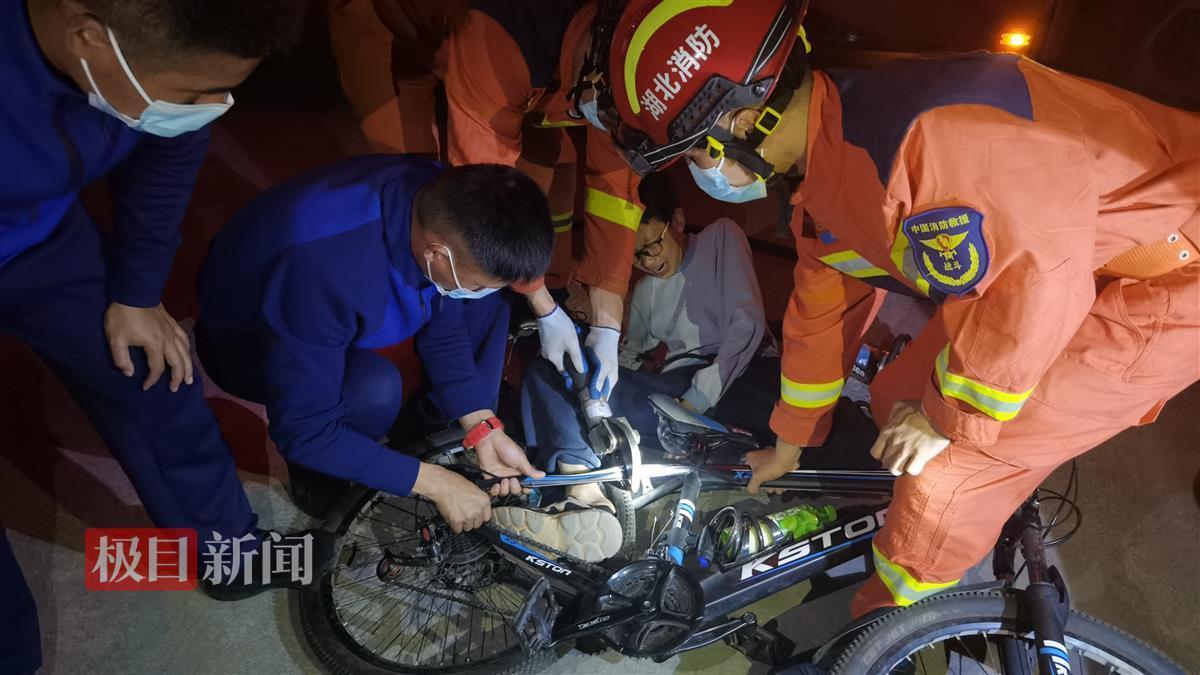 19时18分,到达现场后发现一名男孩脚卡在自行车后轮处,经过勘察和询问得知,因骑车不慎,导致脚部被卡。由于脚部卡住时间较长,被困人员情绪波动较大。