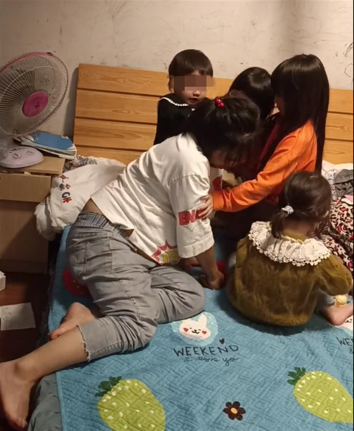 胡女士说,在一起后她才发现丈夫的性格不好,有时会不分场合发脾气,对她和女儿们比较粗鲁。而她是个比较软弱的人,一直将就着,老四和即将出生的老五都是意外怀上的,她也舍不得不要。他们在临海市杜桥镇楼下村的出租屋有两个房间,母女五个住一间,丈夫住另一间,“他嫌住一间吵,我也怕女儿们惹他烦了会遭殃。”
