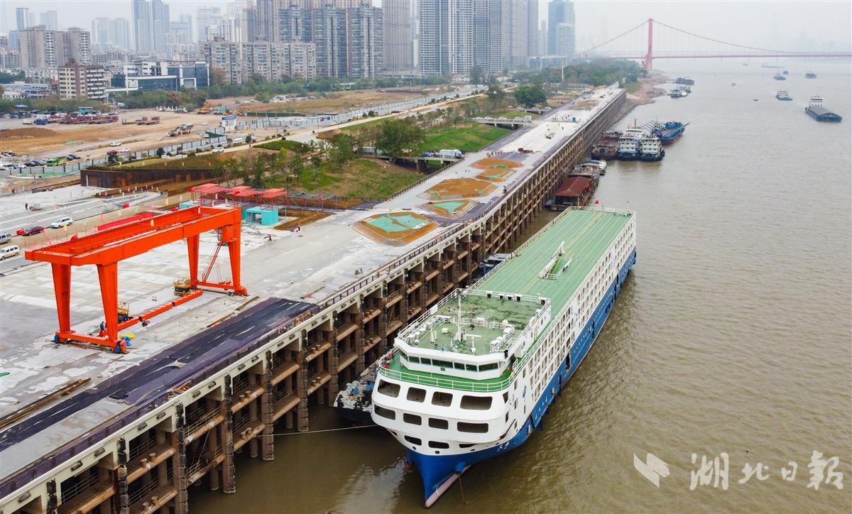 杨泗港都市T台,原为杨泗港国际集装箱码头。记者在项目现场看到,杨泗港都市T台项目以现状港口平台为规划主体,保留部分港口遗迹,通过景观化的手法将工业文化进行还原与再现,打造长江生态码头公园、华中滨江文化秀场。其中最亮眼的是,原有的工业遗迹—龙门架被重新翻新,后续可用于播放水幕电影、做表演舞台等多种用途。