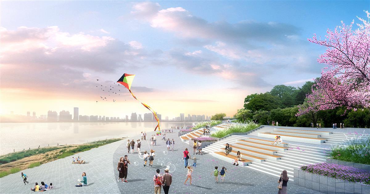 可别小看这2万余平方米的滨江绿地,“微改造”将通过三大策略延续城市广场:功能上,唤醒既有广场空间,串接堤内外慢行交通,增加人的可达性、参与感和舒适度;文化上,结合区域版图,以长江的形态肌理为设计语言,叙述江与城的故事;形象上,柔化临街界面,协调搬迁现状阻点,弱化堤防与城市空间硬性阻隔,营造缓坡式堤防,呈现一幅“樱花漫堤,灿若云霞”的优美画卷。