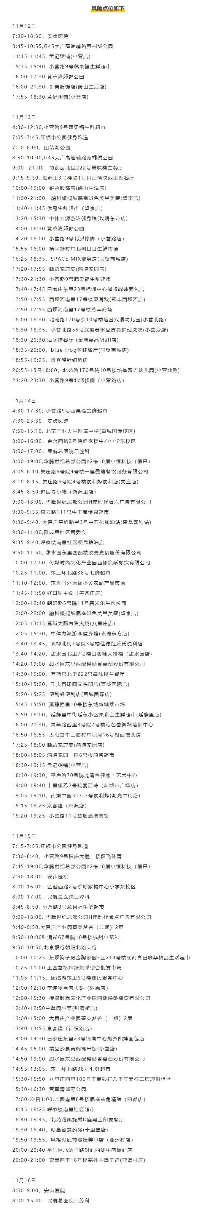 经疾控专家研判,11月17日,北京朝阳区新划定劲松街道华腾园小区5号楼,北京工业大学附属中学(首城国际校区);呼家楼街道呼家楼南里28号楼1单元;团结湖街道团结湖路10号楼2单元,中路南三条2号楼2单元;六里屯街道公园1872小区6号楼C单元,延静东里7号楼,八里庄北里201号楼5单元,水碓子北里25号楼2单元;朝外街道朝阳区芳草地西街12号楼5单元;和平街街道和平街11区26号楼,樱花园小区9号楼,樱花园东街乙二号院1号楼;东湖街道利泽西园一区105号楼,望馨花园211楼,望京西园二区208号楼2单元;望京街道花家地北里2号楼;八里庄街道红庙北里50号楼;大屯街道北四环东路115号院6号楼;十八里店乡小武基陈家村169号、170号、184号、185号,绿洲家园西区1号楼及平房区;三间房乡珠江绿洲家园11号楼;将台乡安家楼村40-102号,梵谷水郡社区4号楼;太阳宫乡牛王庙村东坝河17号楼,75号楼自建房;孙河乡北京金色河畔高尔夫球俱乐部有限公司(顺黄路33号);来广营乡臻园10号楼,动感家园1号楼1单元,北卫家园16号楼5单元;崔各庄乡善各庄周转房3排11号至20号、5排11号至30号和7排1至10号;东坝乡汇景苑三期2号楼3单元,金驹家园D区116号楼3单元;豆各庄乡柠檬晓生活国际公寓(黄厂二店)6单元为高风险,实行“区域封闭,足不出户,上门服务”。