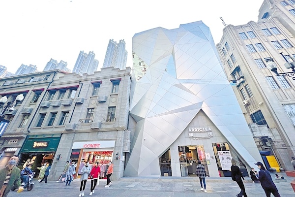 11月17日,在武汉江汉路步行街上,奶茶品牌“顽徒ADDICTEA”全球首家旗舰店奇特的造型吸引着年轻时尚人士光顾打卡。
