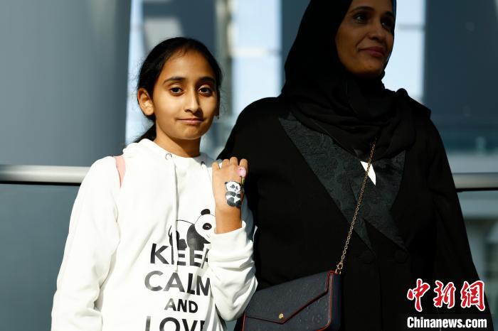 一名卡塔尔小姑娘向记者展示手上的熊猫贴画。 中新社记者 富田 摄
