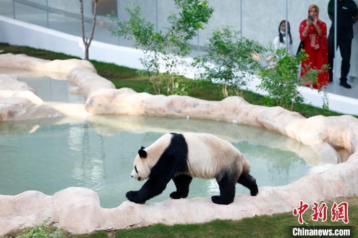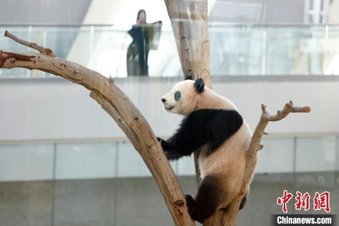 大熊猫“四海”在卡塔尔熊猫馆内。 中新社记者 富田 摄