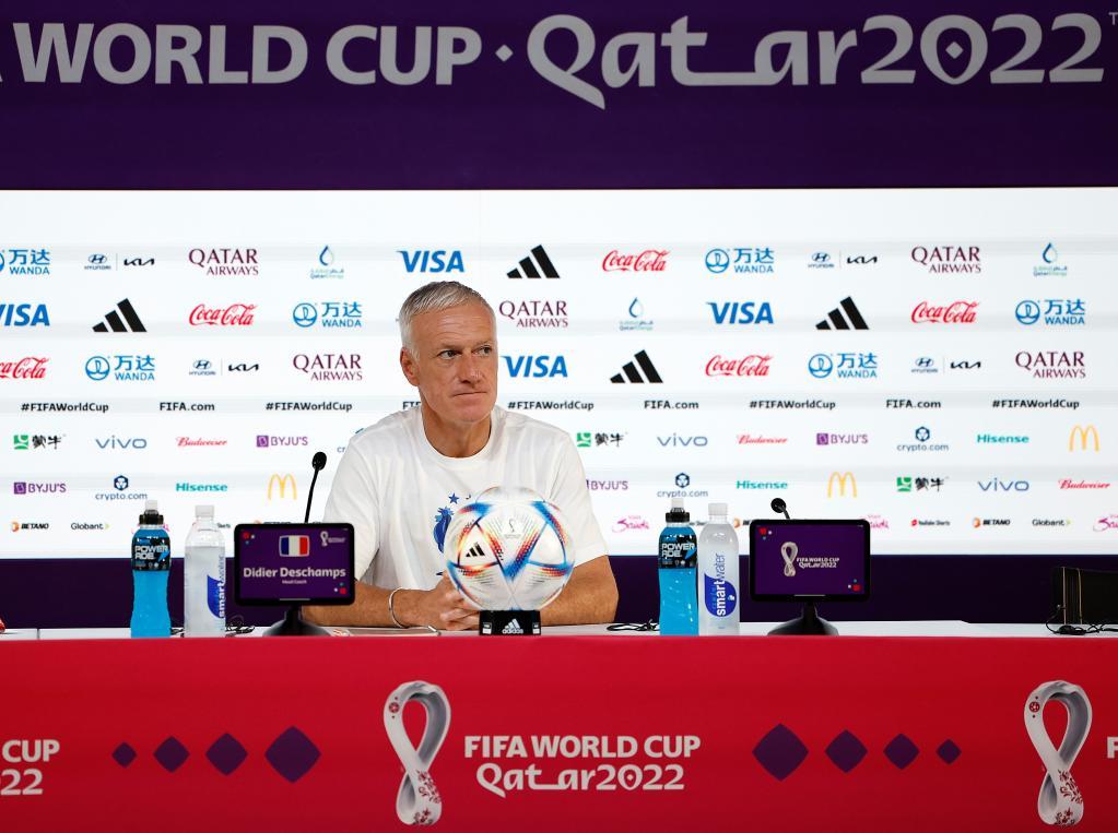 11月21日,法国队在2022年卡塔尔世界杯主新闻中心举行赛前新闻发布会。法国队主教练德尚在新闻发布会上。新华社记者王丽莉摄