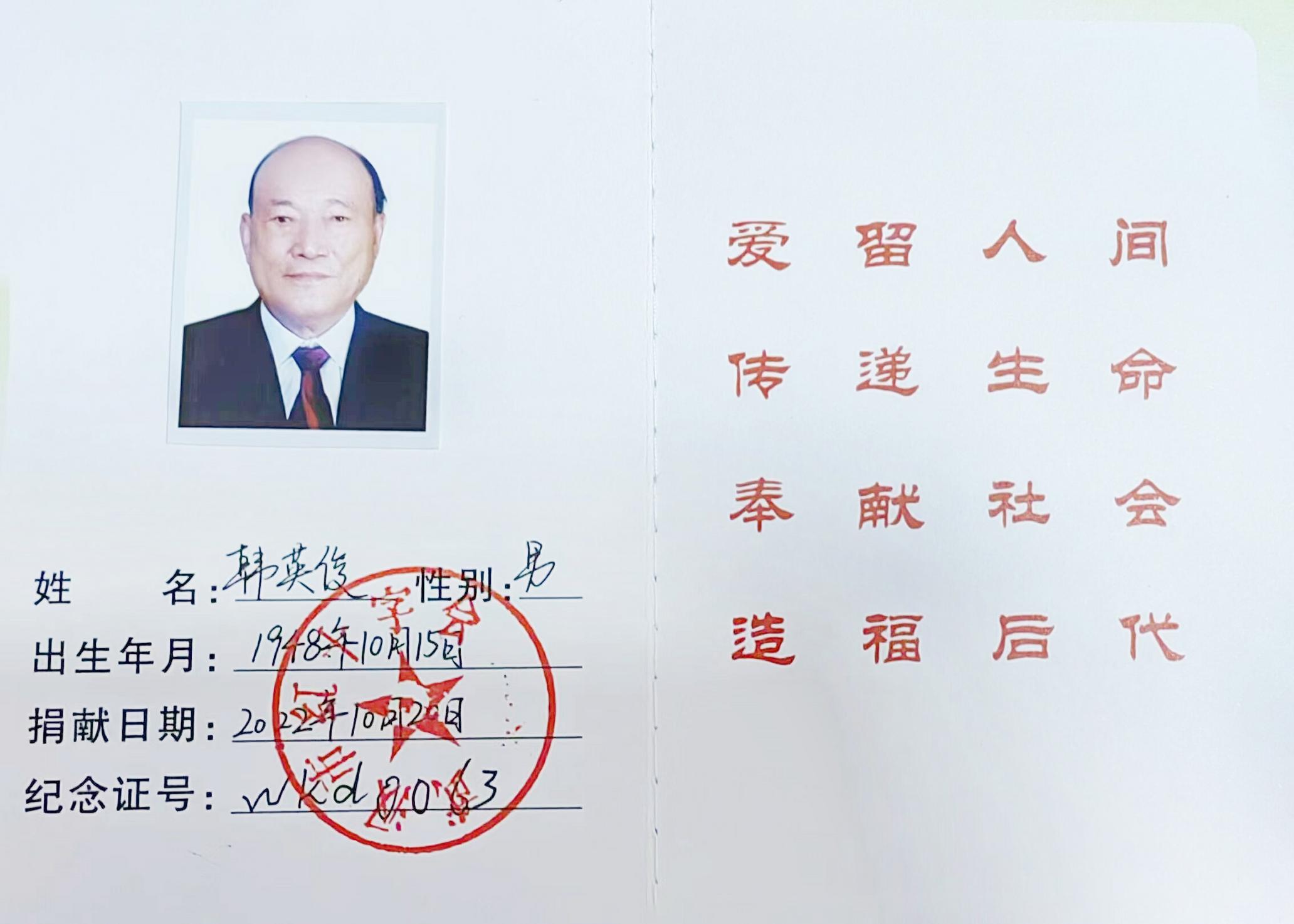 韩英俊志愿捐献遗体纪念证