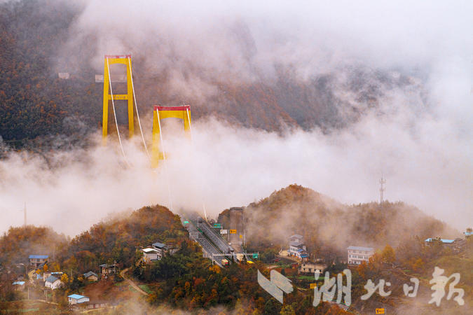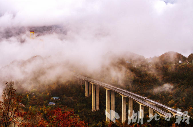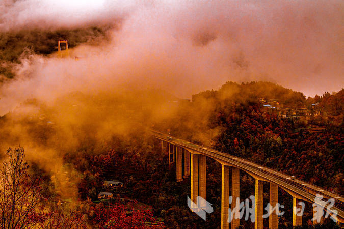湖北日报客户端讯 (通讯员李德荣)11月22日早晨,几天阴雨过后,巴东县野三关四渡河大桥的初冬,漫山彩叶,雨雾缠绕,景色十分壮观。