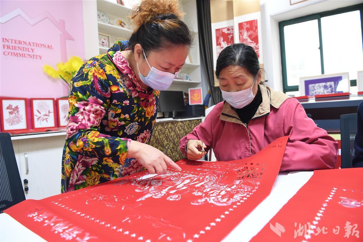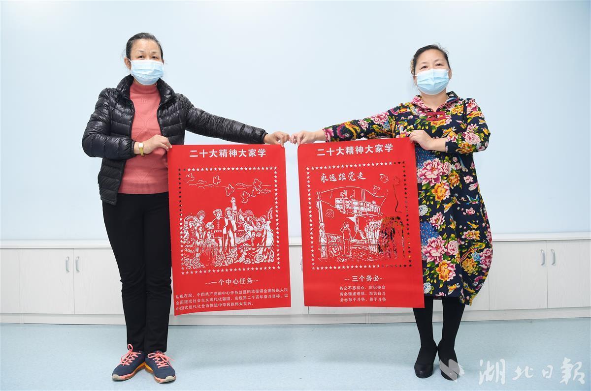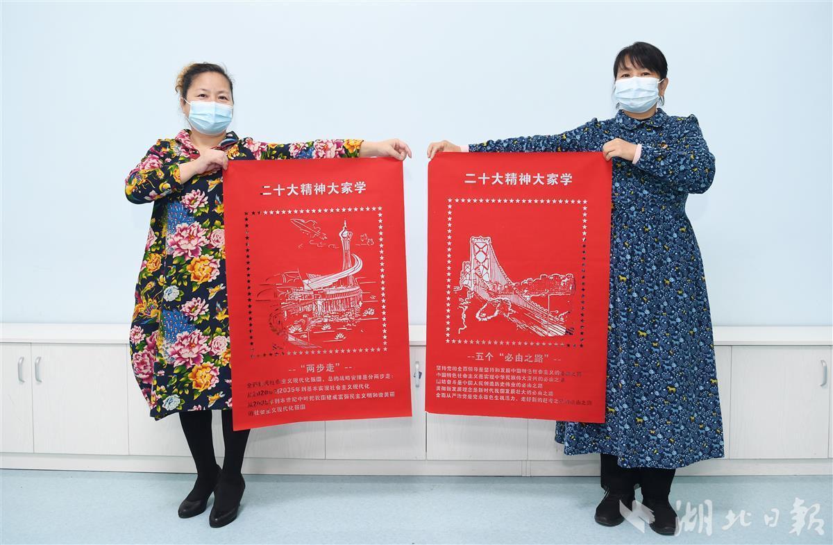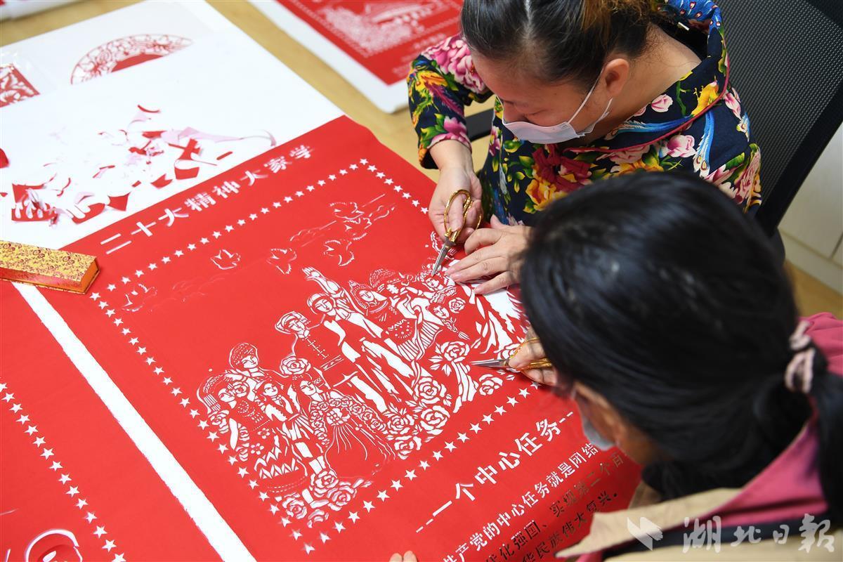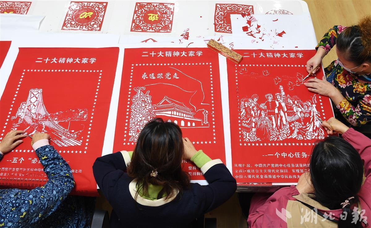 “党的二十大为国家发展绘出宏伟蓝图,我们创作这组剪纸作品就是表达基层群众对党和国家的热爱。”11月22日,武汉市青山区绿景苑社区民俗文化馆里传来阵阵掌声,湖北省剪纸协会副会长彭艳华带领学员们历时半个月共同创作的剪纸雕刻作品《二十大精神大家学》顺利完成,收获社区干部群众的齐声称赞。