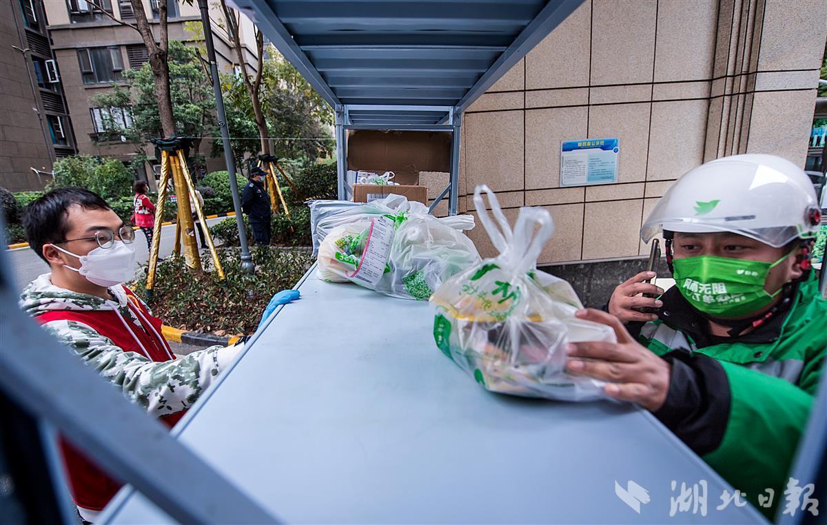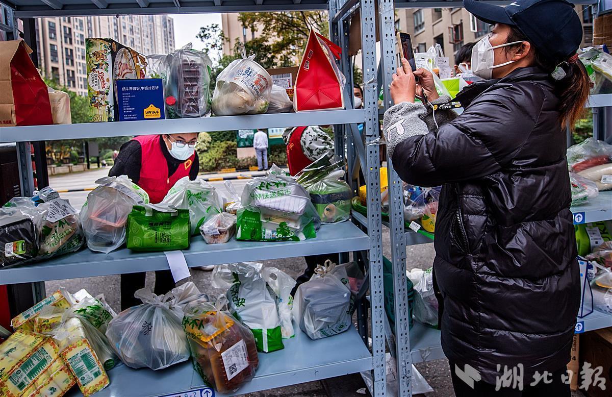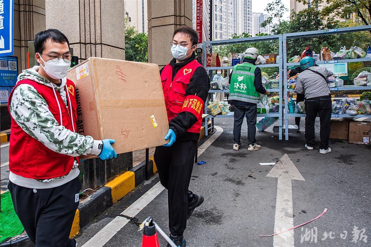 11月23日下午,武汉市洪山区金地自在城东门口,搭建一座2米多高的货架,是该小区的临时“货物中转站”。两名在此值守的黄鹤楼管理处下沉党员客串“货架管理员”,他们负责引导投递员按楼栋放好货物,并帮业主快速找到自己的物品,以减少人员聚焦。