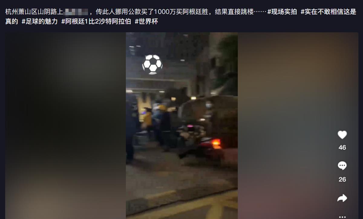 11月22日,世界杯阿根廷与沙特的比赛,阿根廷1比2被沙特逆转,爆出大冷门。网传浙江杭州山阴路附近,有人因用1800万元买阿根廷赢而跳楼自杀。极目新闻记者注意到,网上关于此事有不同版本,还有人称此人资金来源系挪用公款。