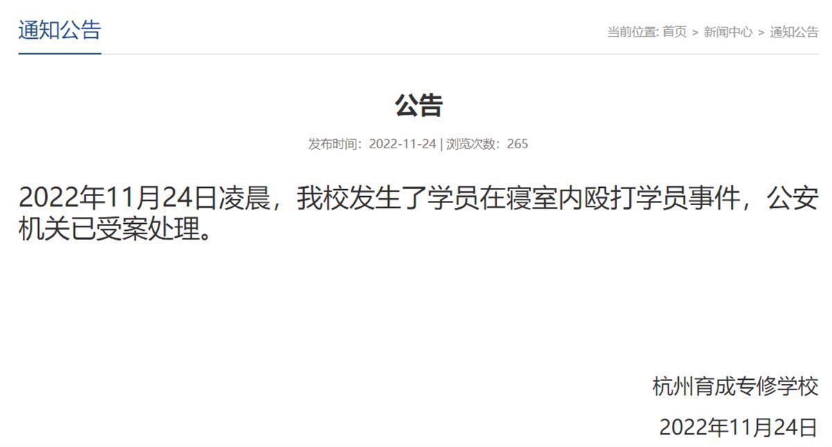 视频在网络传播后引起各方高度关注。杭州育成专修学校发布公告称,“11月24日凌晨,我校发生了学员在寝室内殴打学员事件,公安机关已受案处理。”