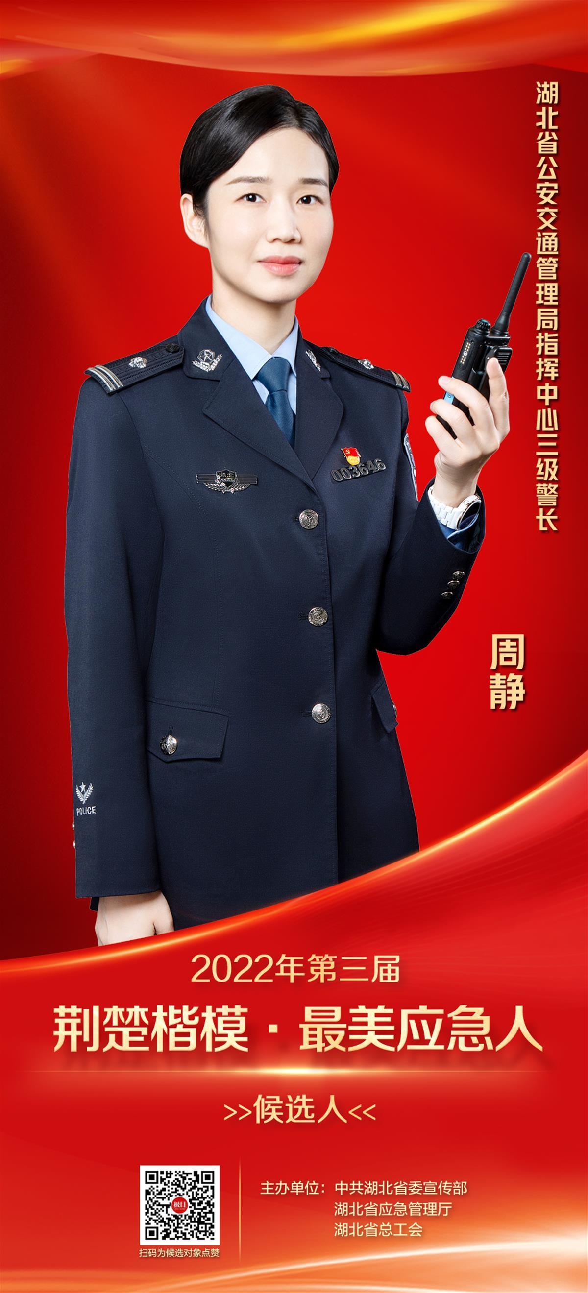 周静,女,34岁,现任湖北省公安交管局指挥中心三级警长,多次荣获省公安厅“优秀公务员”“优秀共产党员”称号,荣获个人三等功1次、嘉奖3次。