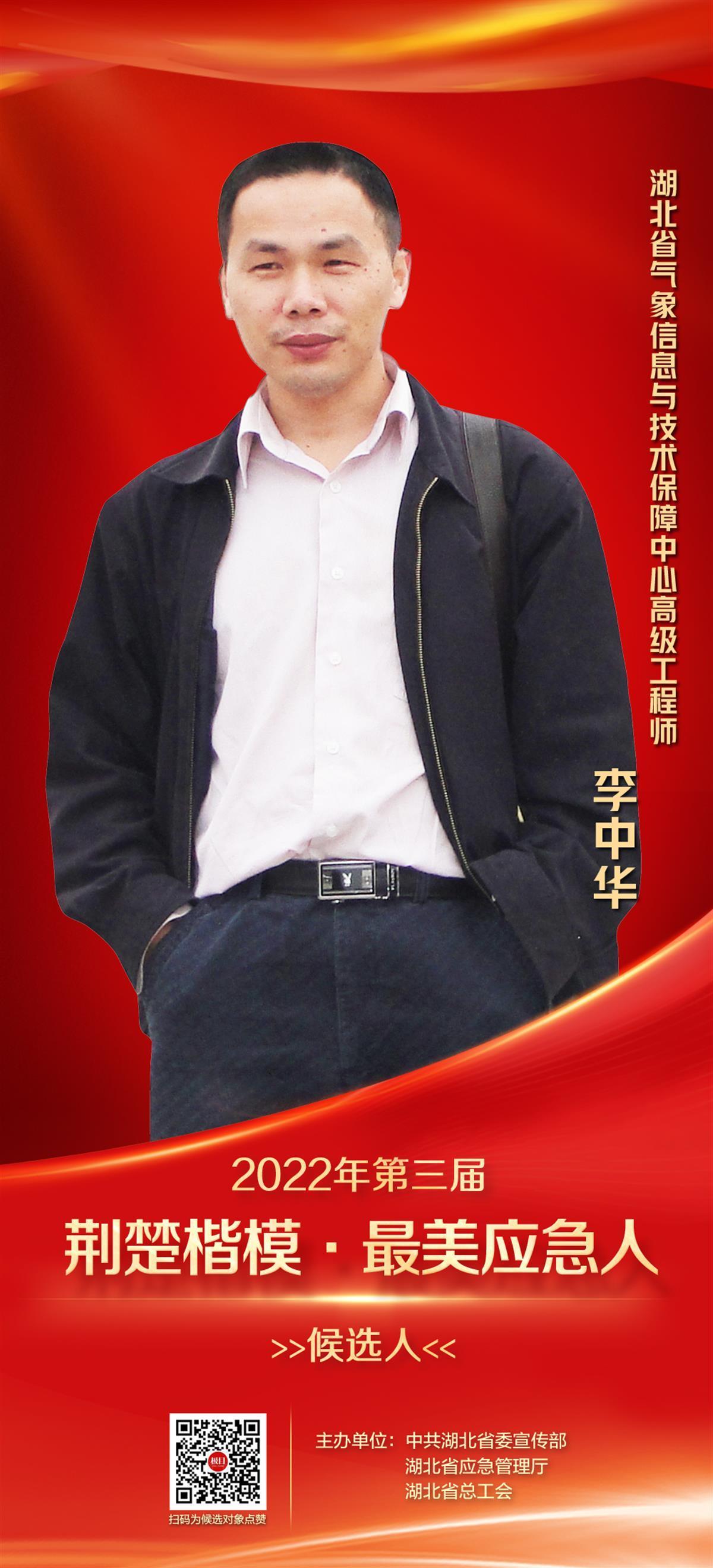 李中华,49岁,现任湖北省气象信息与技术保障中心高级工程师,曾获“全国重大气象服务先进个人”“湖北省气象科技杰出青年”“全省优秀气象业务工作者”等称号。