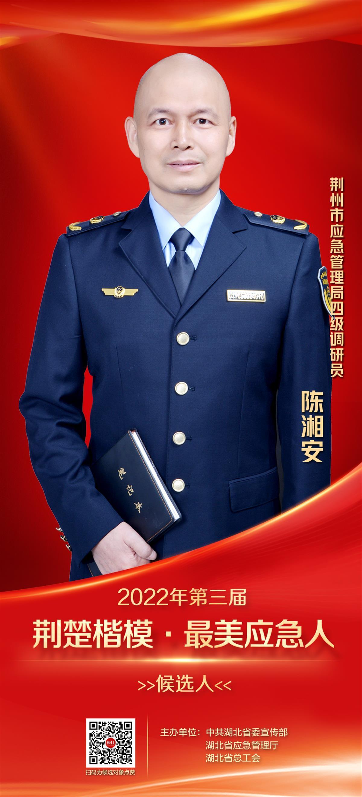 陈湘安,男,48岁,现任湖北荆州市应急管理局四级调研员。先后2次荣立三等功,2018年被湖北省总工会表彰为“全省劳动模范”,获“五一劳动奖章”,同年5月被湖北省政府表彰为“湖北省安全生产优秀工作者”。