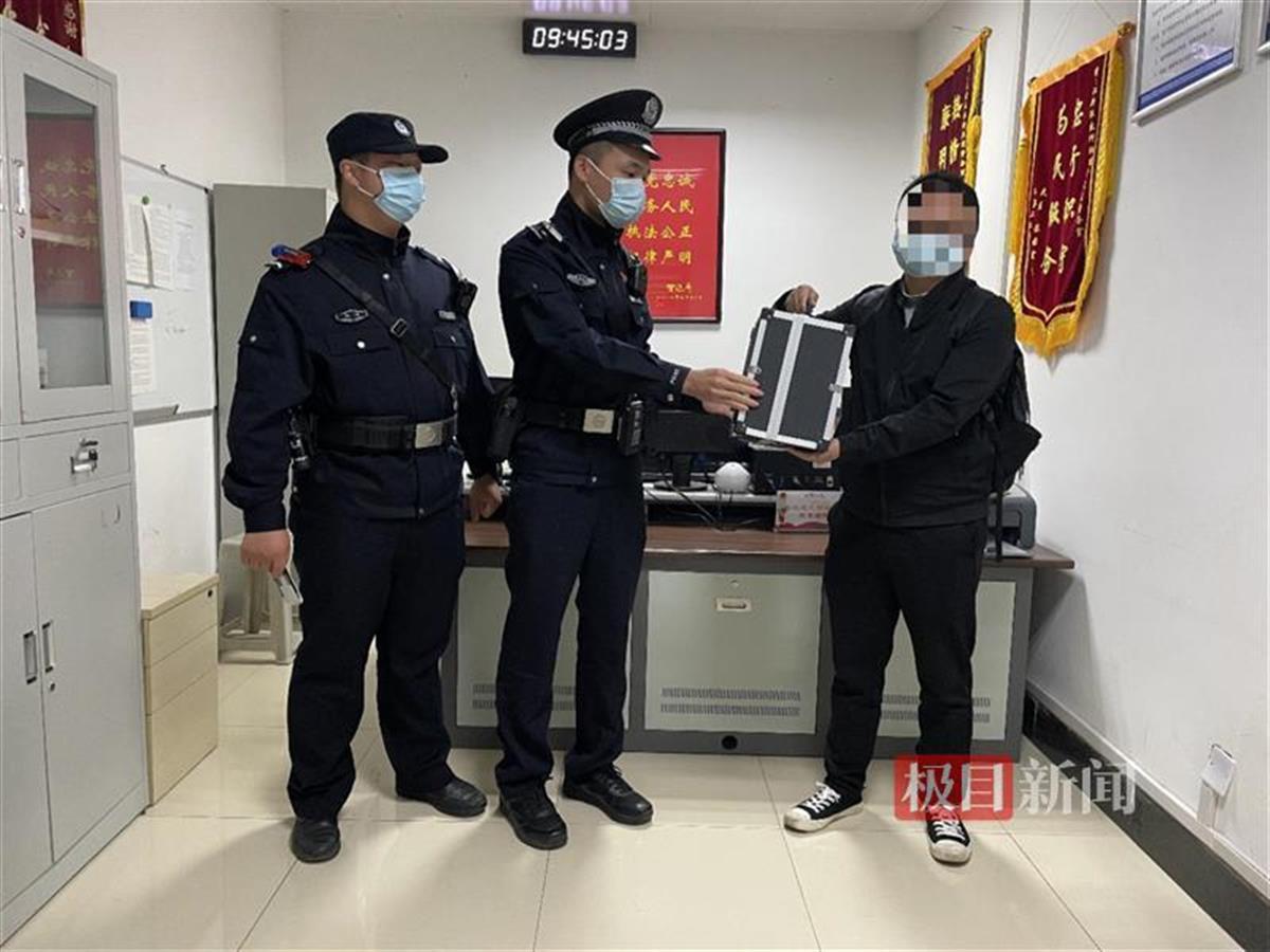 陈仕能立即将情况上报给民警汤淼。汤淼调看监控发现,7点34分的时候,何先生曾在阳逻开发区站D口处接打过电话。在接打电话的过程中,何先生曾将一个黑色的仪器箱放到地上。打完电话离开的时候,他却没把箱子带走。就这样,箱子一直放在通道处,直到不久后被一名保洁员捡走。