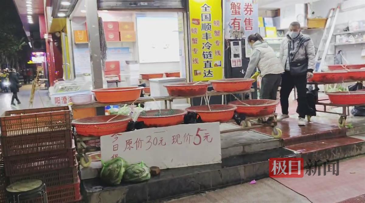 在这条街上,每家店门前都摆起了装满螃蟹的容器,有一部分贴上了醒目的价签。其中,一家店挂出的特价标签上写着:原价每只30元,特价5元一只,相当于降价八成。