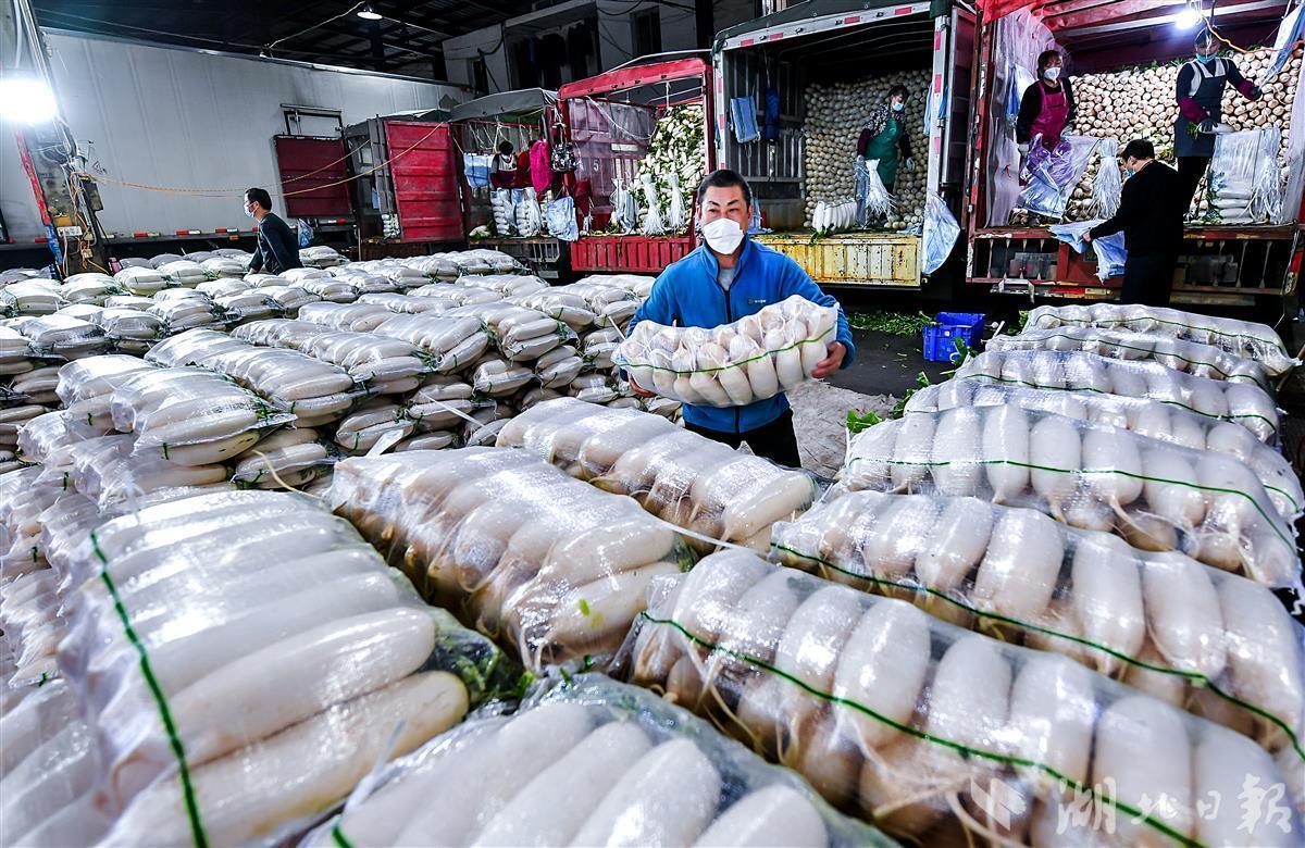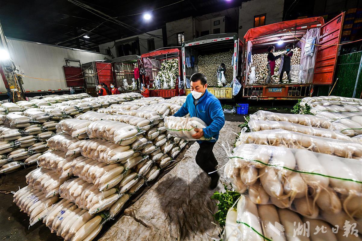 据了解,白沙洲农副产品大市场作为武汉最大的“菜篮子”,占全市蔬菜日成交量七成左右。为应对疫情,打赢保供战,白沙洲市场制定了一套切实可行的应急预方案,为武汉市大型商超提供定点采购服务,同时,为社区提供送货上门服务,让“菜篮子”供应更暖心。(湖北日报全媒记者 朱熙勇 摄)