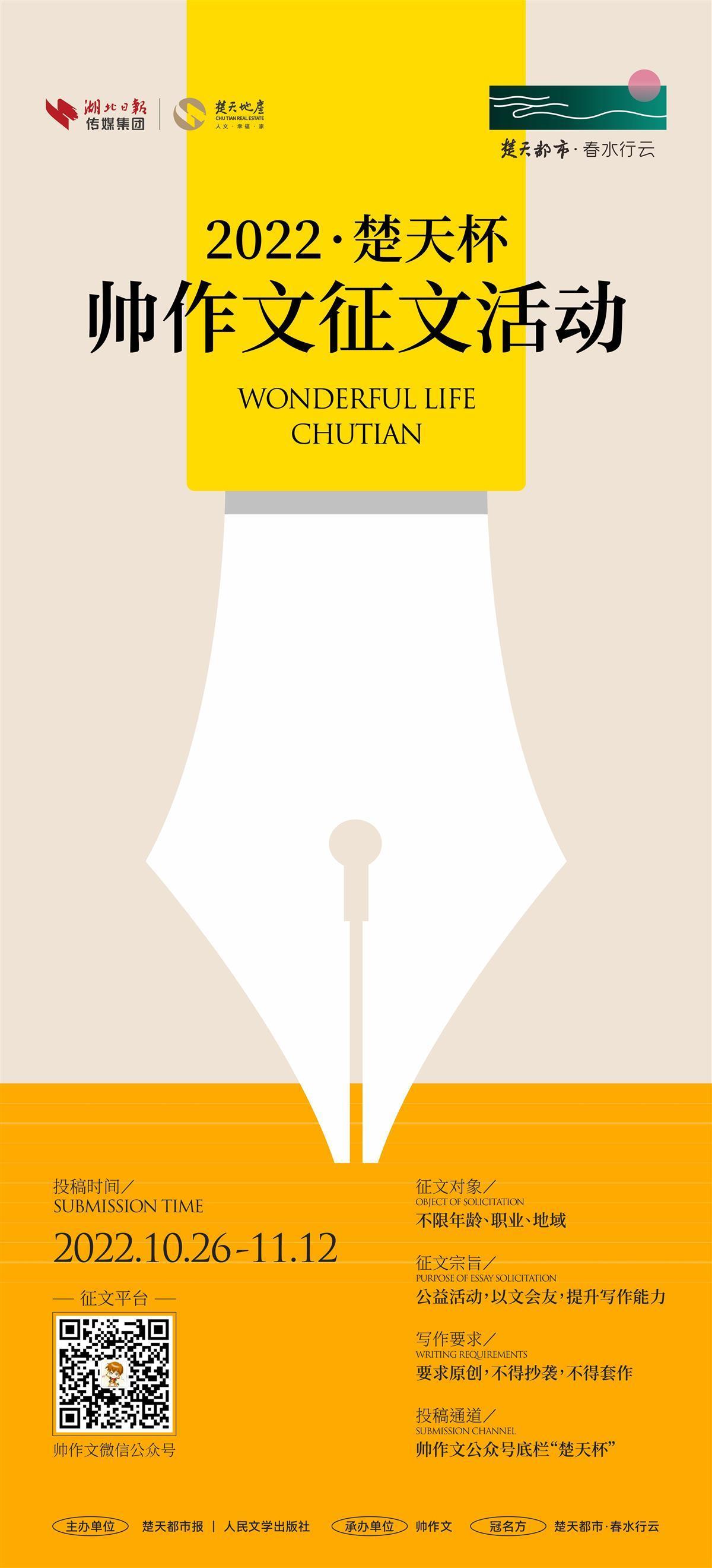 楚天地产.春水行云2022楚天杯帅作文征文活动成果抢先看——500篇以上优秀稿件今起在帅作文微信公众号(shuaizuowenzb)上展示,并进行人气投票。投票排名靠前的作品将获得免费公开出版机会或其它丰厚奖品。