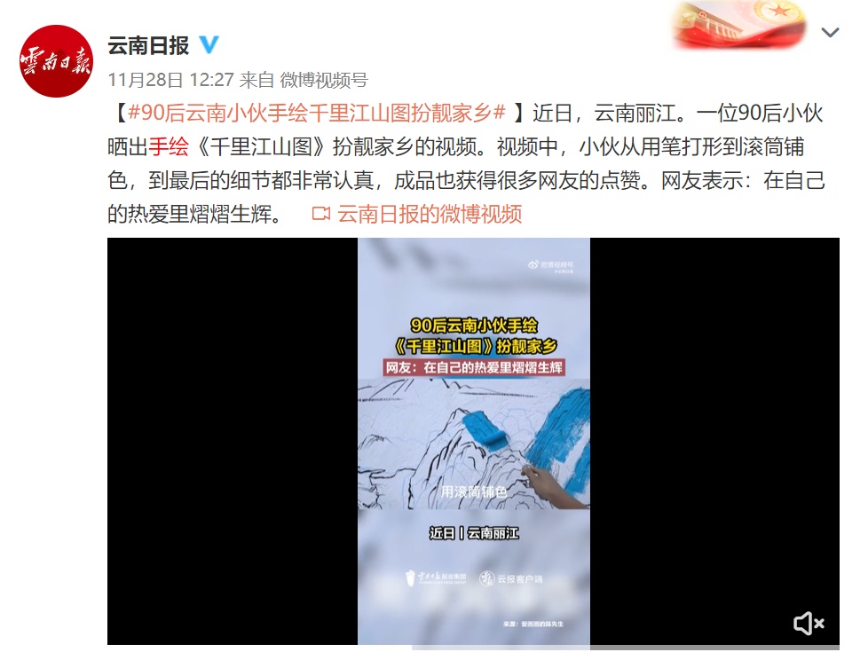 【90后云南小伙手绘千里江山图扮靓家乡】近日,云南丽江。一位90后小伙晒出手绘《千里江山图》扮靓家乡的视频。视频中,小伙从用笔打形到滚筒铺色,到最后的细节都非常认真,成品也获得很多网友的点赞。网友表示:在自己的热爱里熠熠生辉。