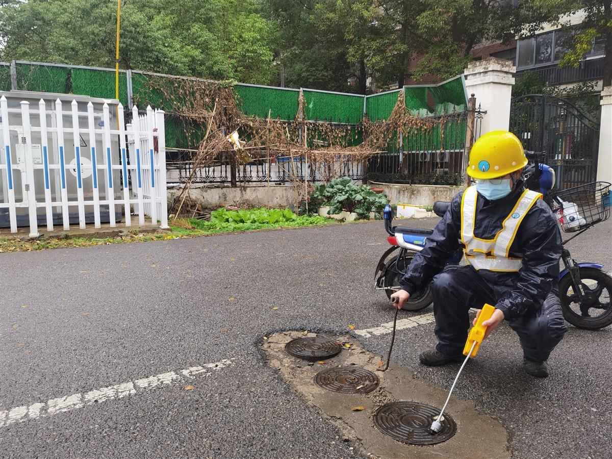 行至野芷湖南路,余泽洋拿着燃气检漏仪,不断弯腰进行管道检测。路上每到一个阀门井口,余泽洋都要停下脚步,弯腰打开阀门井盖,将检漏仪的金属探头伸入燃气阀门井盖内,检查燃气管线及其设施是否正常,并传回相关数据。