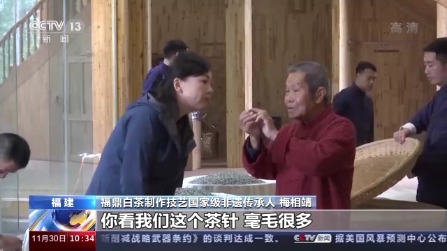 福鼎白茶制作技艺国家级非遗传承人 梅相靖:焙好之后,我们要眼观茶色,看一下色泽怎么样,你看我们这个茶针,毫毛很多。第二,要捏一下,针会刺手的,把它拗一下,它声音很响亮的,说明它的干度就够了。