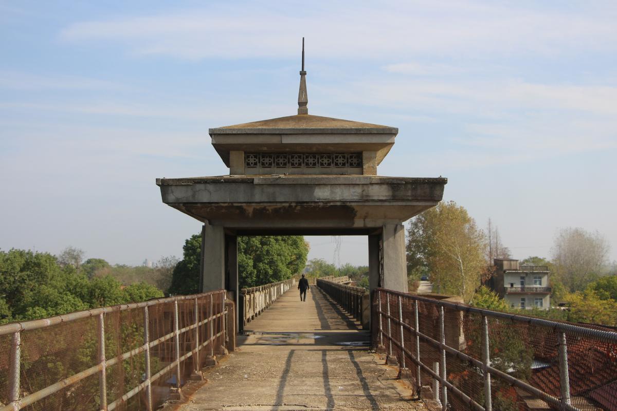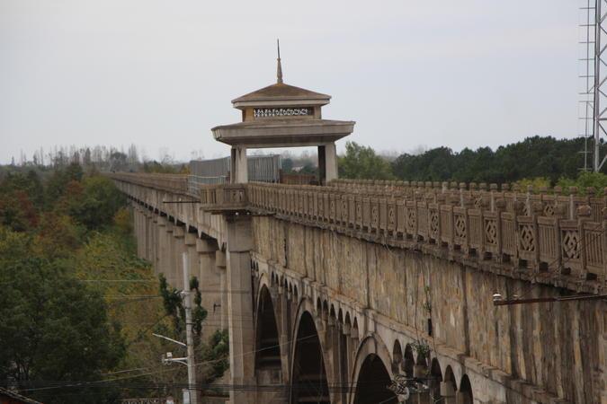 陆山渡槽,在这里将河流、铁路、树林融为一体,成为孝感市一道靓丽的人文、历史、地理景观。