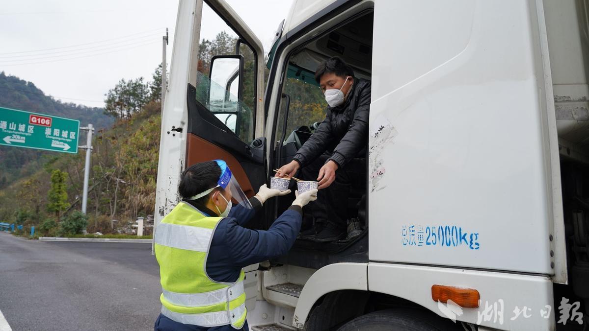 “真的是谢谢你们,每天都要麻烦你们端饭过来,还给我准备热水、水果和防疫物资,真是太感谢了。”12月1日,因车辆故障“滞留”杭瑞高速崇阳东高速口的江苏司机于其华,从防疫服务站值守人员手中接过爱心午餐,感动地说道。