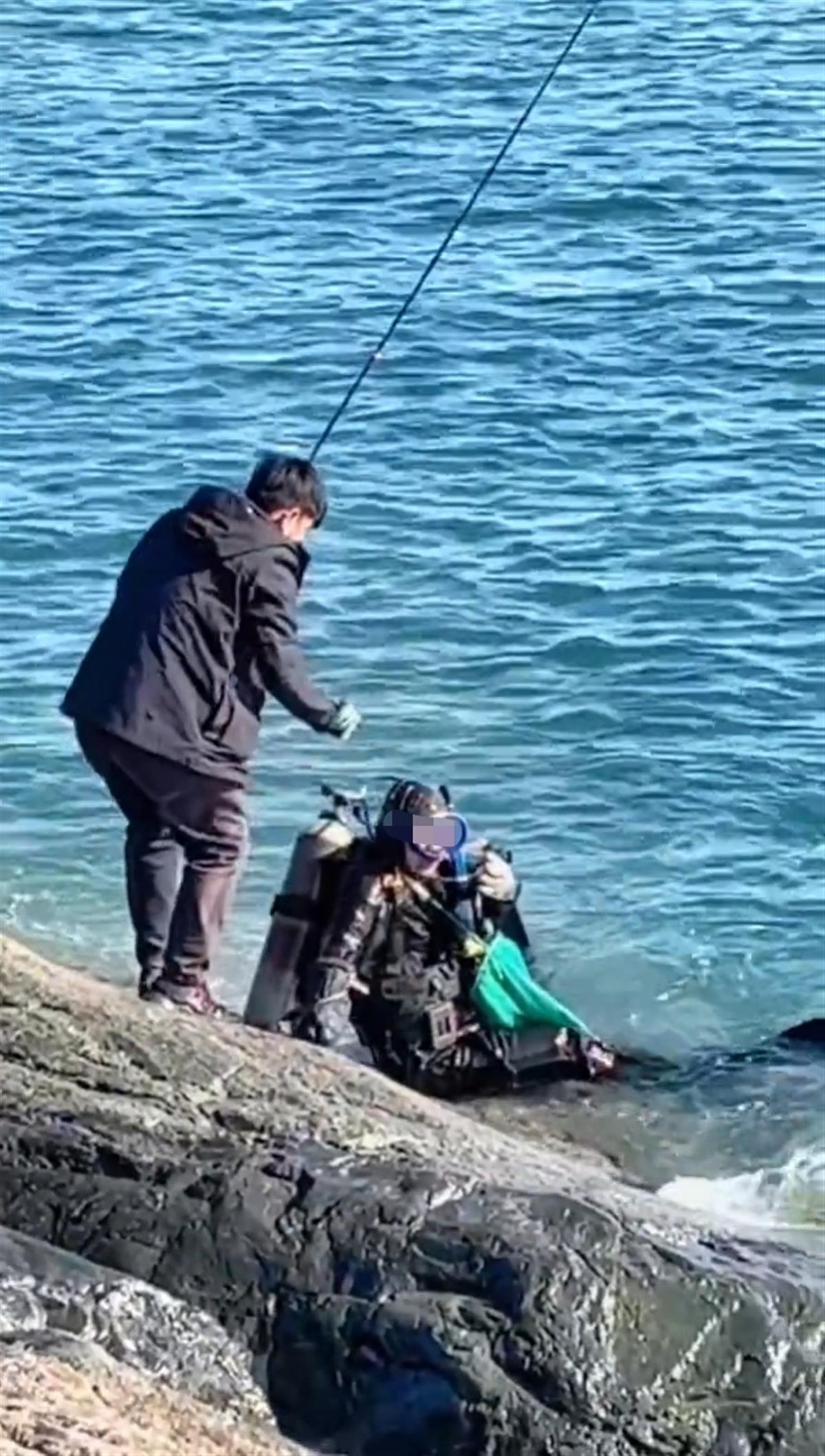 李先生觉得很有趣,拍视频记录下了这一幕。他说,潜水男子上岸后再次入海,刻意跟他们保持了距离,没想到不一会又被对面礁石的钓友勾住,被迫上岸后,就不敢下去了。