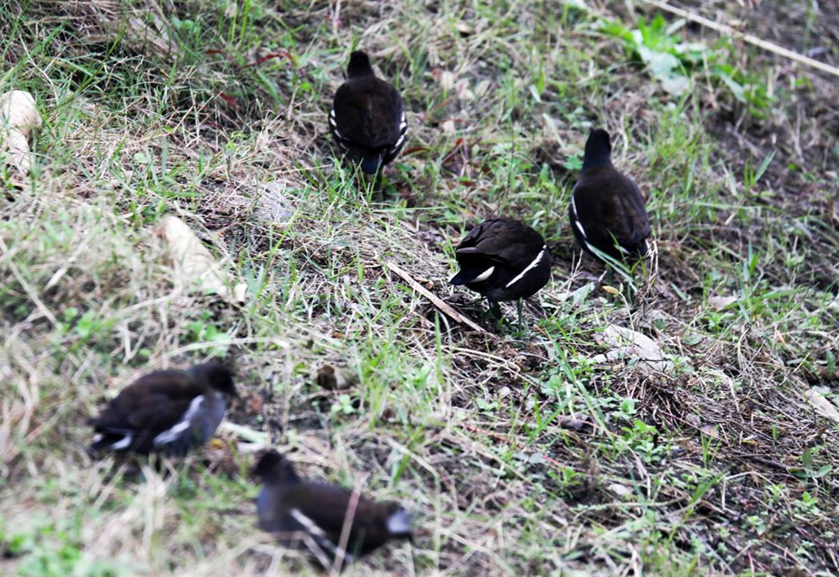 12月3日,十几只黑水鸡“做客”湖北竹山县城西湿地公园,它们或在岸上觅食,或在水中游弋,为湿地增添了几分野趣。