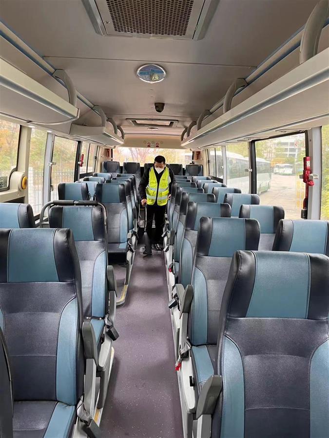 江汉明介绍,12月4日晚,接到292路、292Q复线通知,线长就和他、站管员方舟及其它站长一起,携带84消毒水、专用喷壶、拖把、抹布等工具挨个上车,对线路55台车进行了彻底消杀,不放过每个角落。
