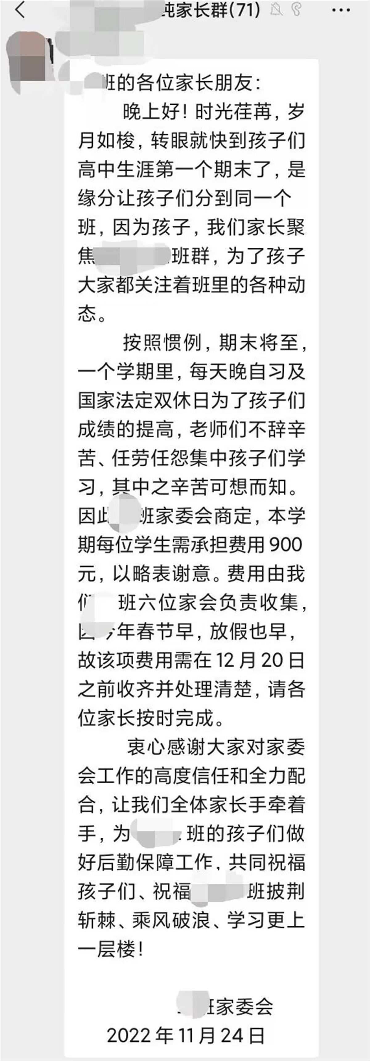 极目新闻记者从王先生发来的微信截图看到,一个名称为某高中家长群的微信群有71名家长。一名家委于11月24日发布通知称,“一个学期里,每天晚自习及国家法定双休日为了孩子们成绩的提高,老师们不辞辛苦、任劳任怨集中孩子们学习,其中之辛苦可想而知。因此家委会商定,本学期每位学生需承担费用900元,以略表谢意。”该通知称,费用由六位家委负责收集。该项费用需在12月20日之前收齐并处理清楚,请各位家长按时完成。而该通知发布后,许多家长都通过微信群转账,均已被接收,还有人展示收款截图。
