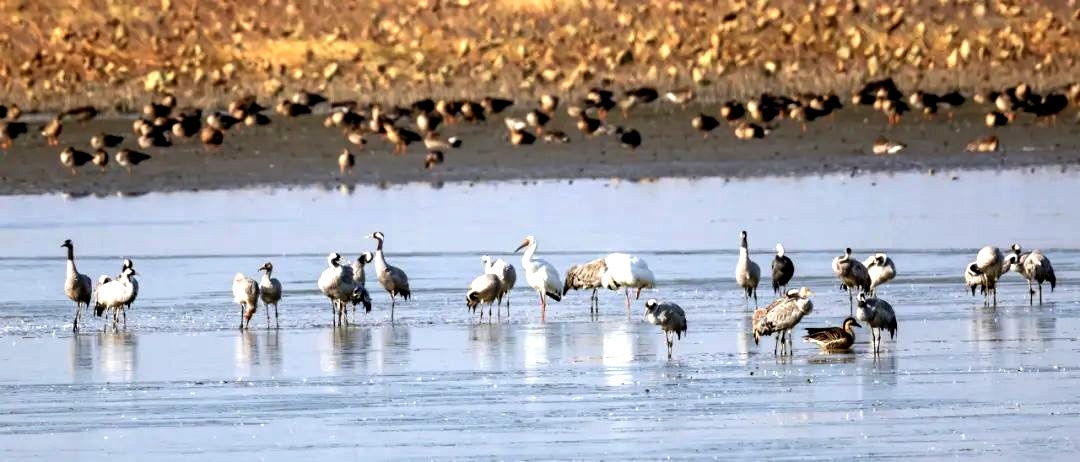 每年冬季,沉湖是来汉候鸟开年会最热门地,比如去年8.5万只冬候鸟聚会于此,这是沉湖自2008年有观测记录以来的最高纪录。