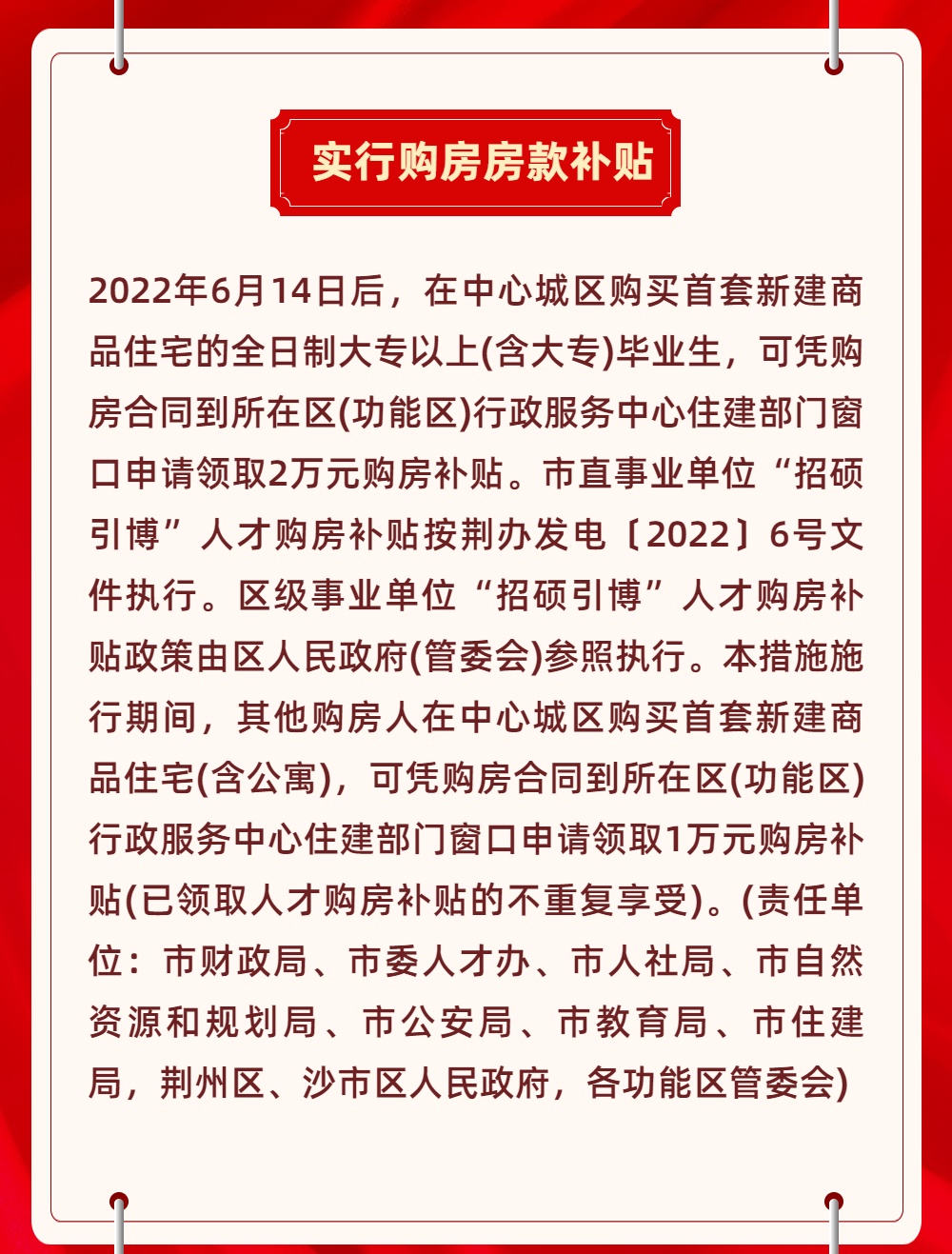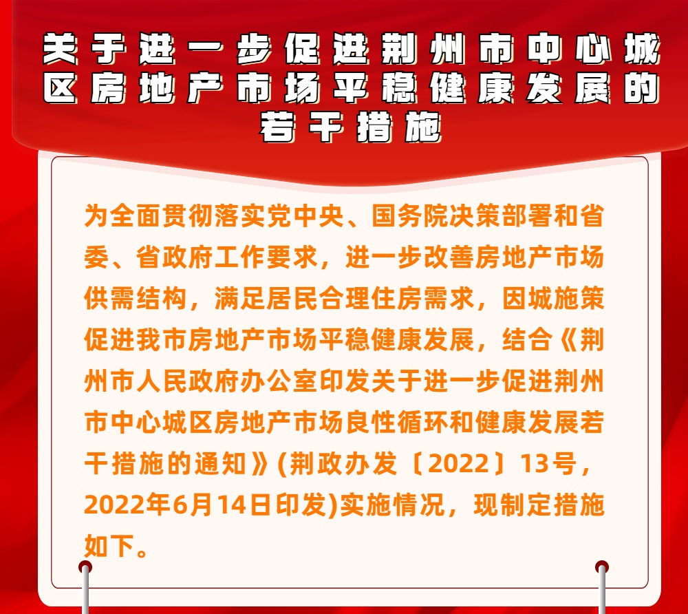 荆州市人民政府办公室印发关于进一步促进中心城区房地产市场平稳健康发展若干措施的通知。一起来看看具体有哪些吧↓↓