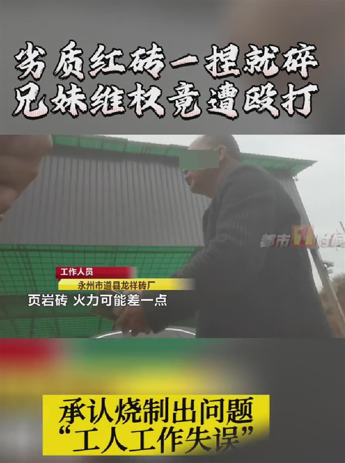 据报道,2022年7月,道县钟家两兄妹的自建房开工,10月底房子建到三四层时,工人发现红砖存在质量问题,搁置一段时间会出现自然风化的情况,有的甚至一捏就碎,随即停工。11月上旬,钟家两兄妹向龙祥砖厂讨说法时,在争吵中,二人被砖厂人员殴打,红砖质量问题也未得到有效回应,担心已砌的墙体坍塌。此外,当地还有一位老人的自建房用砖也出现了类似情况,多次与龙祥砖厂协商,无实质性进展。