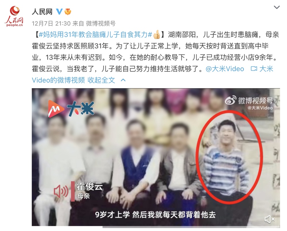 湖南邵阳,儿子出生时患脑瘫,母亲霍俊云坚持求医照顾31年。为了让儿子正常上学,她每天按时背送直到高中毕业,从未有迟到。如今,在她的耐心教导下,儿子已成功经营小店9余年。霍俊云说,当我老了,儿子能自己努力维持生活就够了。