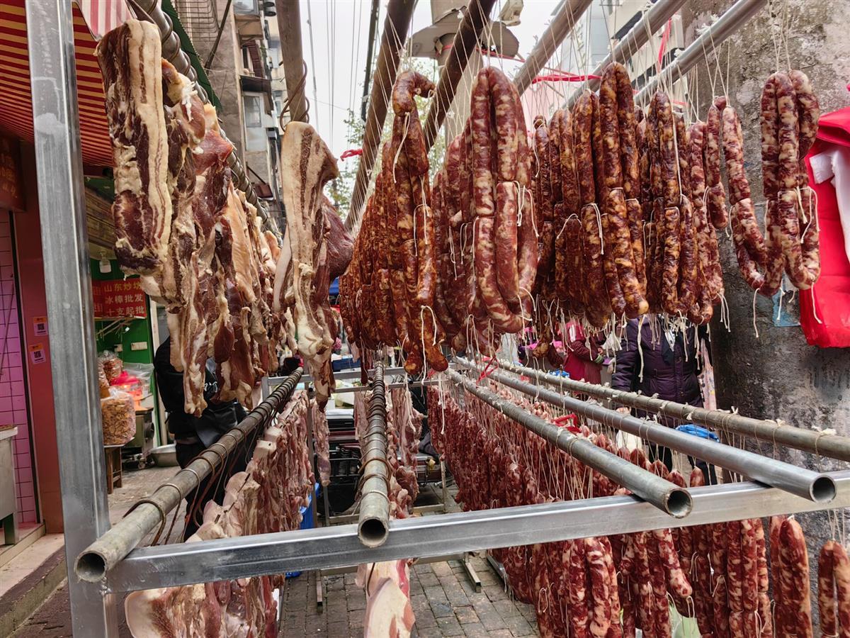 在汉口北湖的一家老字号灌肠铺子里,已经灌制完成的腊肠摆在门前晾晒,几乎占据了一整条道路。工作人员介绍,最近猪肉降价比较明显,吸引更多人来灌肠:“今年灌肠启动的时间比较晚,但刚刚一开始就很火热。”
