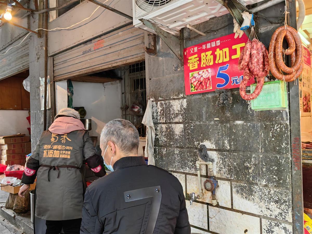 12月6日一早,位于汉口江大路的菜市场外,几家主营猪肉的店铺门前都挂上了成串的腊肠。在店内的墙壁上则贴着“灌肠加工”的字样,不时有市民上前询问代工灌肠的行情。