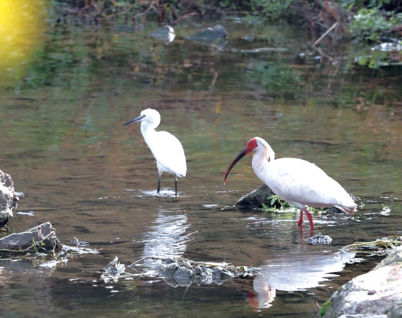 这只朱鹮时而在清澈河水觅食,时而飞进附近茂密的水草里歇息。