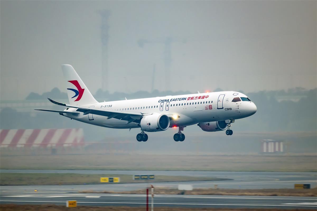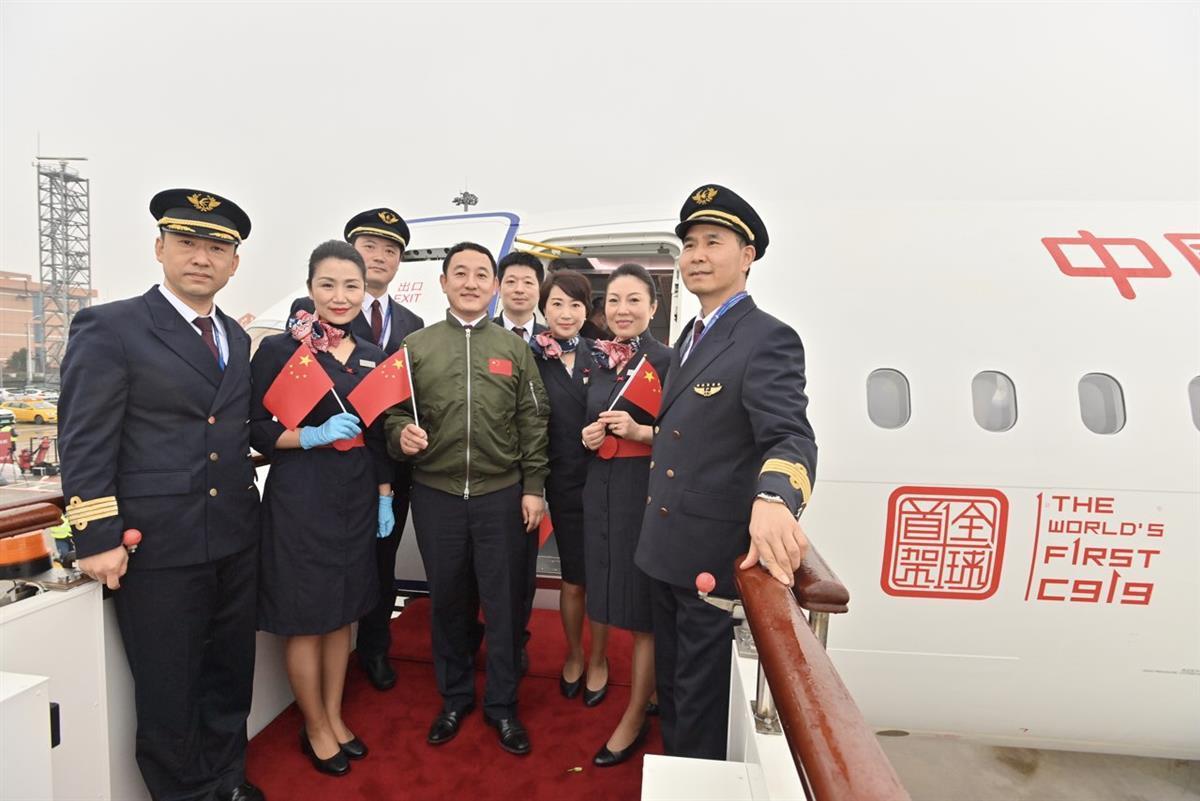 MU919航班是当天11时39分从上海浦东机场起飞的,当班乘务长通过客舱广播致欢迎词:“中国东航迎来了全球首架C919大型民航客机,很荣幸能和您共同亲历和见证这一激动人心的时刻。我们即将乘坐自己的大飞机,满怀雄心壮志翱翔蓝天……这一段短短的航程,将是我国大飞机投入商业运营的重要里程碑!”