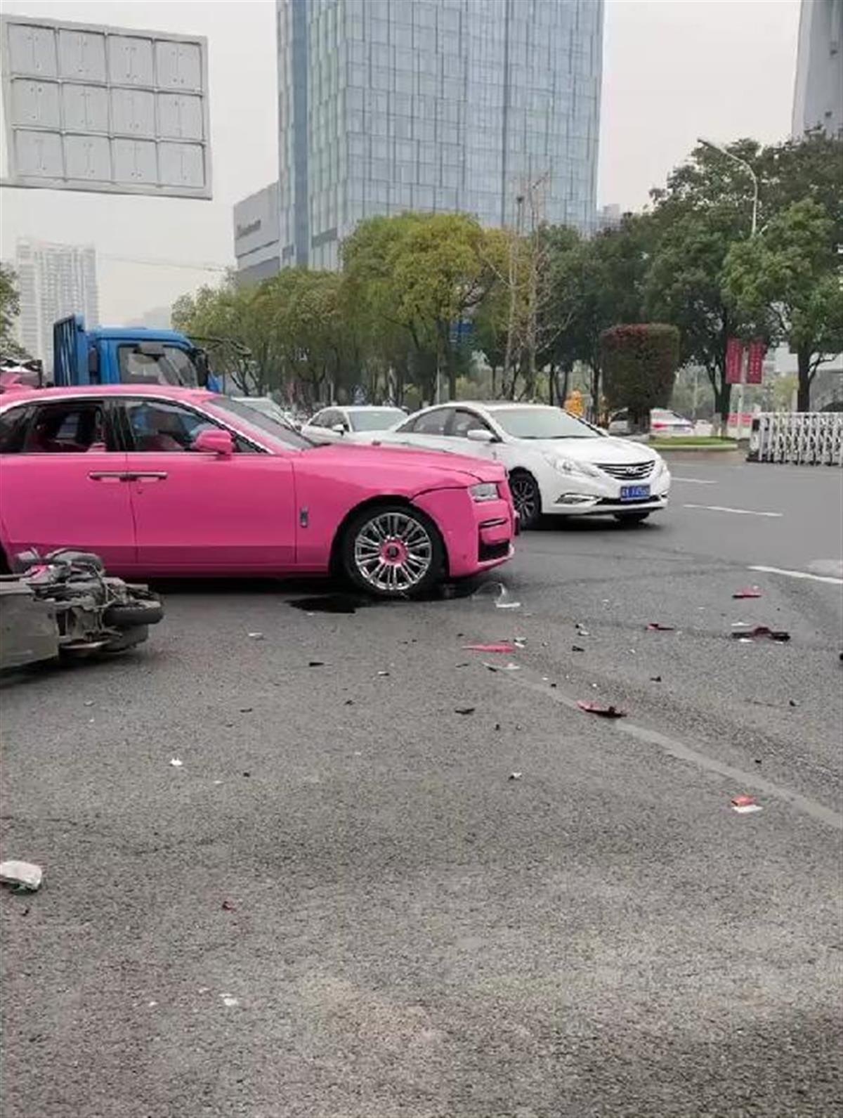 12月8日,江苏南京发生了一起车祸事故,一辆摩托车与一辆粉色劳斯莱斯相撞。9日,当地交警告诉极目新闻记者,事发后民警赶往现场进行了处置,事故未造成人员受伤,双方车辆受损,但都有保险。