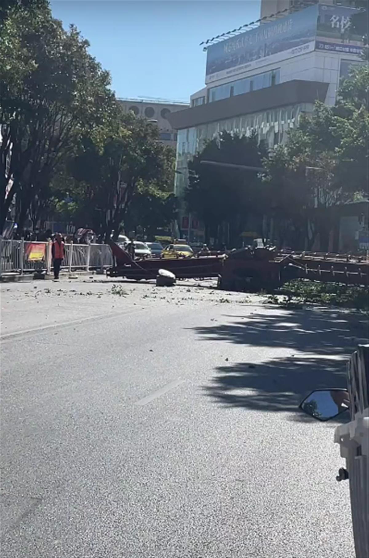 一位市民从高处拍摄的画面显示,一架数十米高的大型机器发生倒塌,将路边围挡砸出一个巨大豁口。细看发现,边上还有一辆吊车的吊臂此前已经倒伏,吊车的车身高高翘起。另一段现场画面显示,倒塌的机器占据了将近一半道路,现场交通中断。