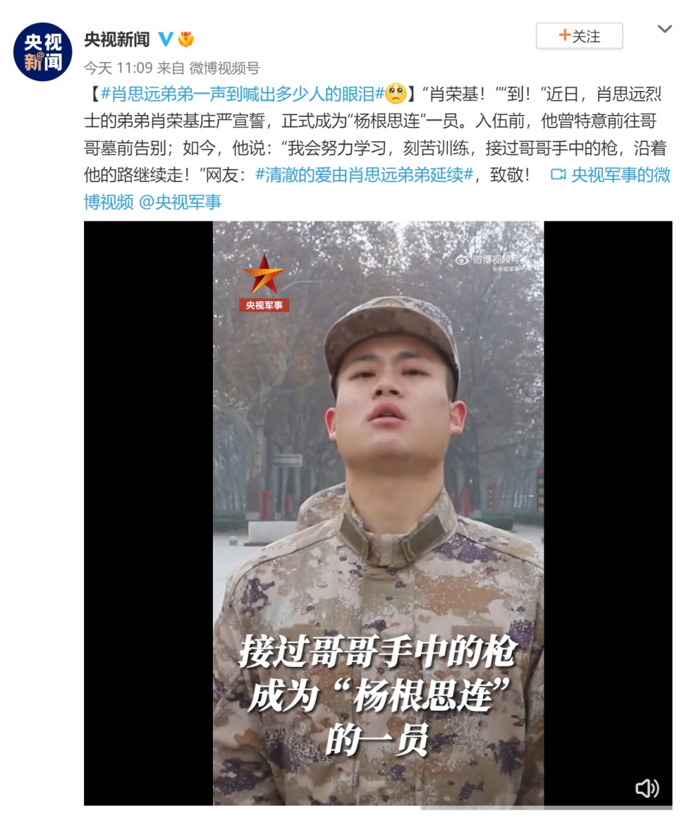 【肖思远弟弟一声到喊出多少人的眼泪】“肖荣基!”“到!”近日,肖思远烈士的弟弟肖荣基庄严宣誓,正式成为“杨根思连”一员。入伍前,他曾特意前往哥哥墓前告别;如今,他说:“我会努力学习,刻苦训练,接过哥哥手中的枪,沿着他的路继续走!”网友:清澈的爱由肖思远弟弟延续,致敬!