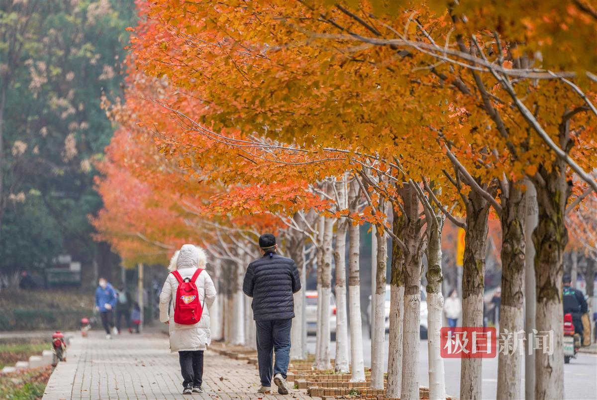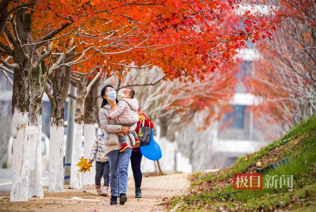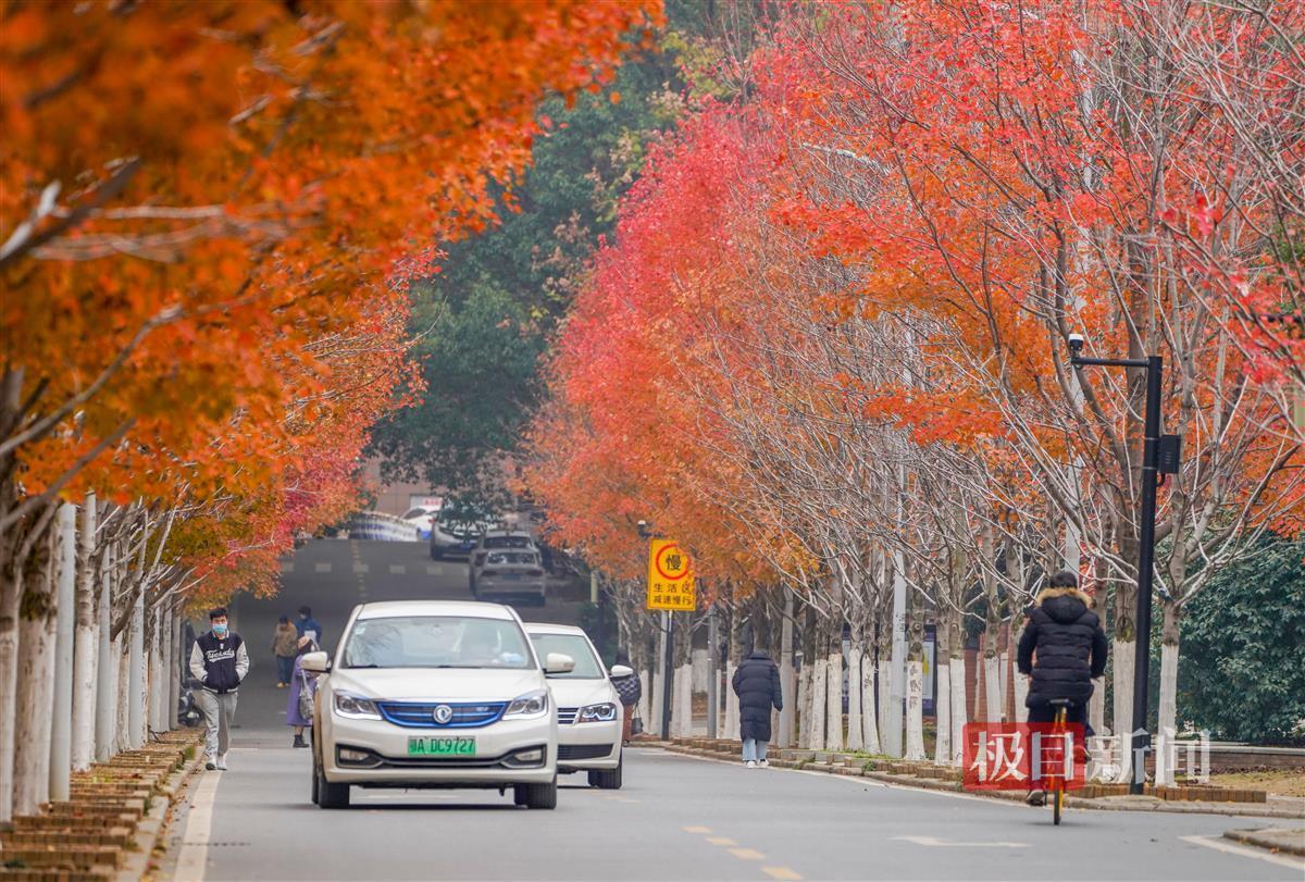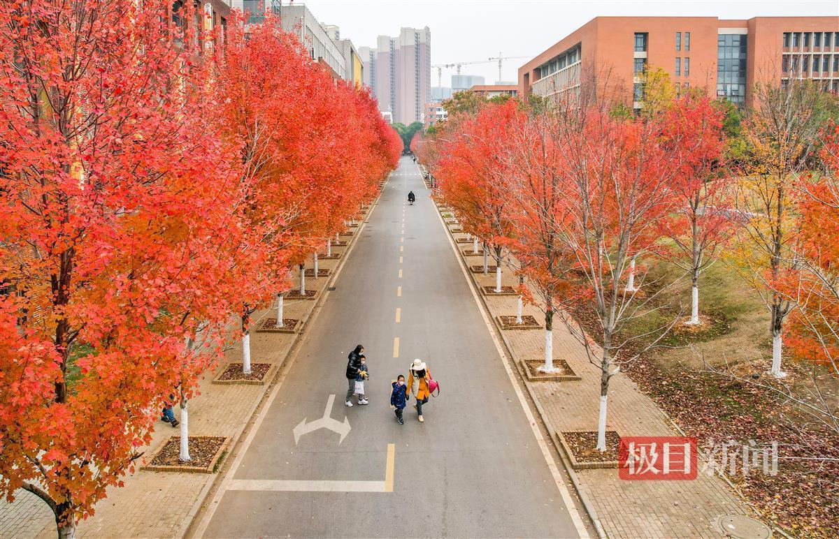 12月11日,极目新闻记者在文华学院看到,即使立冬已有月余,但该校内2000余株红枫树尚有约一半仍未掉叶。在忽隐忽现的阳光下,已经红透了的枫叶显得格外红艳。三三两两的师生和家属穿梭在红枫树下,或拍照留影,或拾起红艳艳的枫叶。