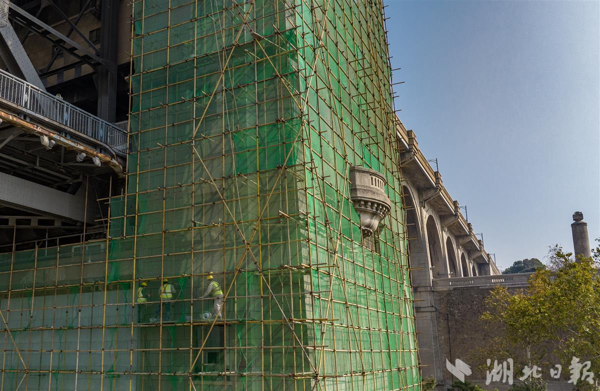 12月12日,经过保护修缮的武汉长江大桥汉阳岸桥头堡展露新颜。今年9月6日,武汉长江大桥桥头堡及铁路引桥梁拱处既有外墙装饰面层开始实施改造,这是武汉长江大桥自1957年建成通车以来首次对桥头堡进行修缮。此次修缮秉承着保护历史文化、延续城市历史文脉的设计原则,在保持原有外观颜色的基础上对桥头堡外观装饰层进行加固型修缮。目前,武昌岸桥头堡还在修缮中,预计本月完工。