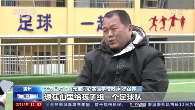 大方县对江镇元宝同心实验学校教师 徐召伟:我是一个球迷,拿了足球就在球场上踢,孩子们看我一踢,一下子兴趣就来了,人山人海地冲向一个球,我觉得震撼,原来山里的孩子也特别喜欢足球。于是我就动了一个想法,想在山里给孩子组一个足球队。