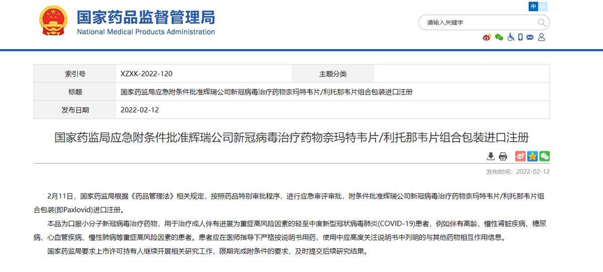 记者在国家药监局网站上看到,今年2月11日,国家药监局根据《药品管理法》相关规定,按照药品特别审批程序,进行应急审评审批,附条件批准辉瑞公司新冠病毒治疗药物奈玛特韦片/利托那韦片组合包装(即Paxlovid)进口注册。根据国家药监局网站介绍,本品为口服小分子新冠病毒治疗药物,用于治疗成人伴有进展为重症高风险因素的轻至中度新型冠状病毒肺炎(COVID-19)患者,例如伴有高龄、慢性肾脏疾病、糖尿病、心血管疾病、慢性肺病等重症高风险因素的患者。患者应在医师指导下严格按说明书用药,使用中应高度关注说明书中列明的与其他药物相互作用信息。国家药监局要求上市许可持有人继续开展相关研究工作,限期完成附条件的要求,及时提交后续研究结果。今年,《新型冠状病毒肺炎诊疗方案(试行第九版)》,将Paxlovid写入诊疗方案。