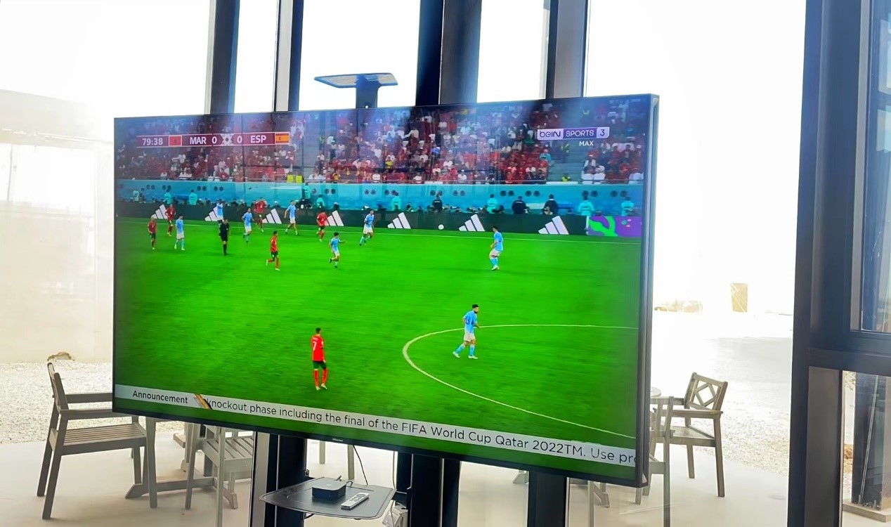 如果不去现场看球,住在球迷村的球迷会围聚在餐厅,通过一台海信电视看球。尽管卡塔尔阳光强烈,不过这台电视完全没有被外面的光照影响。