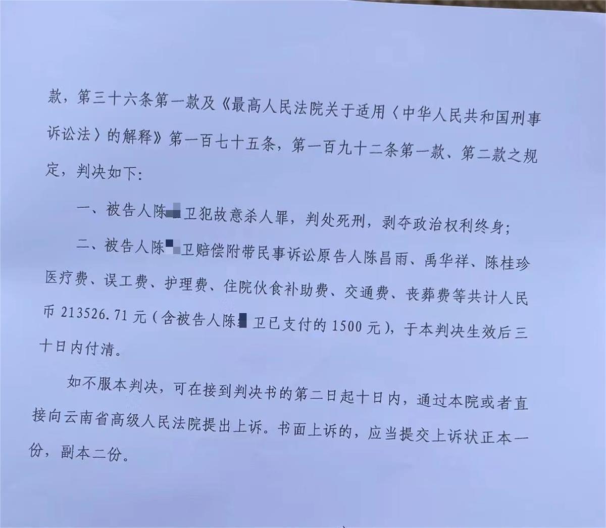 据了解,今年7月,该案在曲靖市中级人民法院开庭审理,未当庭宣判。12月16日,该案一审宣判。法院判决陈某卫犯故意杀人罪,依法判处死刑,剥夺政治权利终身;赔偿附带民事诉讼原告人陈昌雨、禹华祥、陈桂珍医疗费、误工费、护理费、住院伙食补助费、交通费、丧葬费等共计人民币213526.71元(含被告人陈某卫已支付的1500元),于判决生效后三十日内付清。