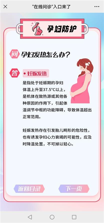 小程序怎么用?程序内有多项功能,操作方法很简单。如打开“孕妇防护”项时,可以看到“孕妇发热怎么办”“就医”“急诊120指征”等多项内容,选择“翻页”或“返回目录”就能实现回到主页或进入下一页。